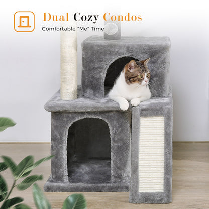With 2 double condos, a perch, an enclosed scratcher panel, and a removable fabric hammock tunnel, your cats can play and relax in comfort.