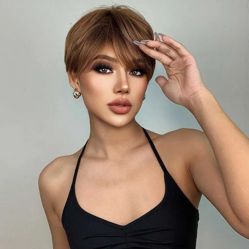 ✓ Texture / Longueur : Droite, coupe courte (style pixie/effilé)