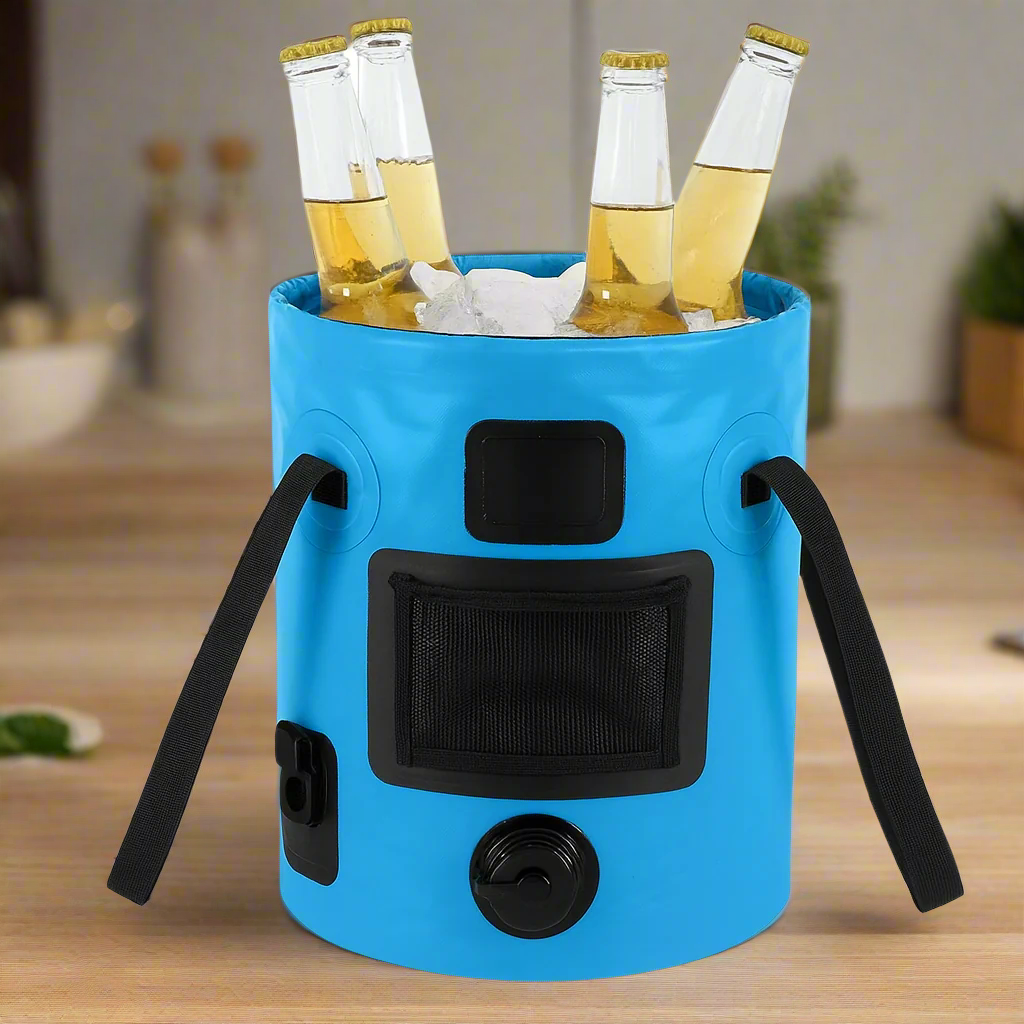 Pliable, poignée de transport, valve pour contrôle du débit, sac filet amovible pour filtrer les débris