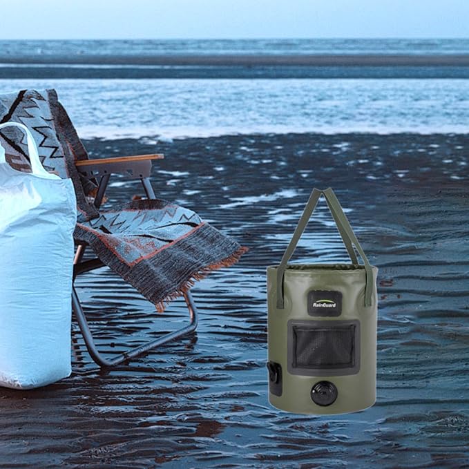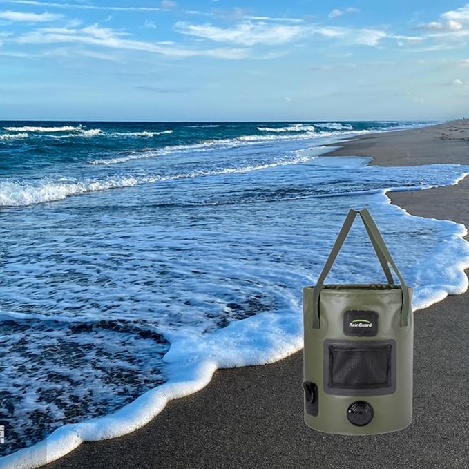 Pliable, poignée de transport, valve pour contrôle du débit, sac filet amovible pour filtrer les débris
